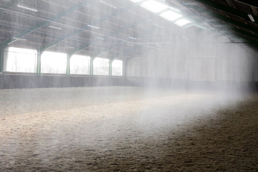 Systemet består av rör som placeras längs ridbanans kanter. Genom strategiskt placerade munstycken sprids en fin vattendimma som håller underlaget fuktigt och minskar mängden damm.