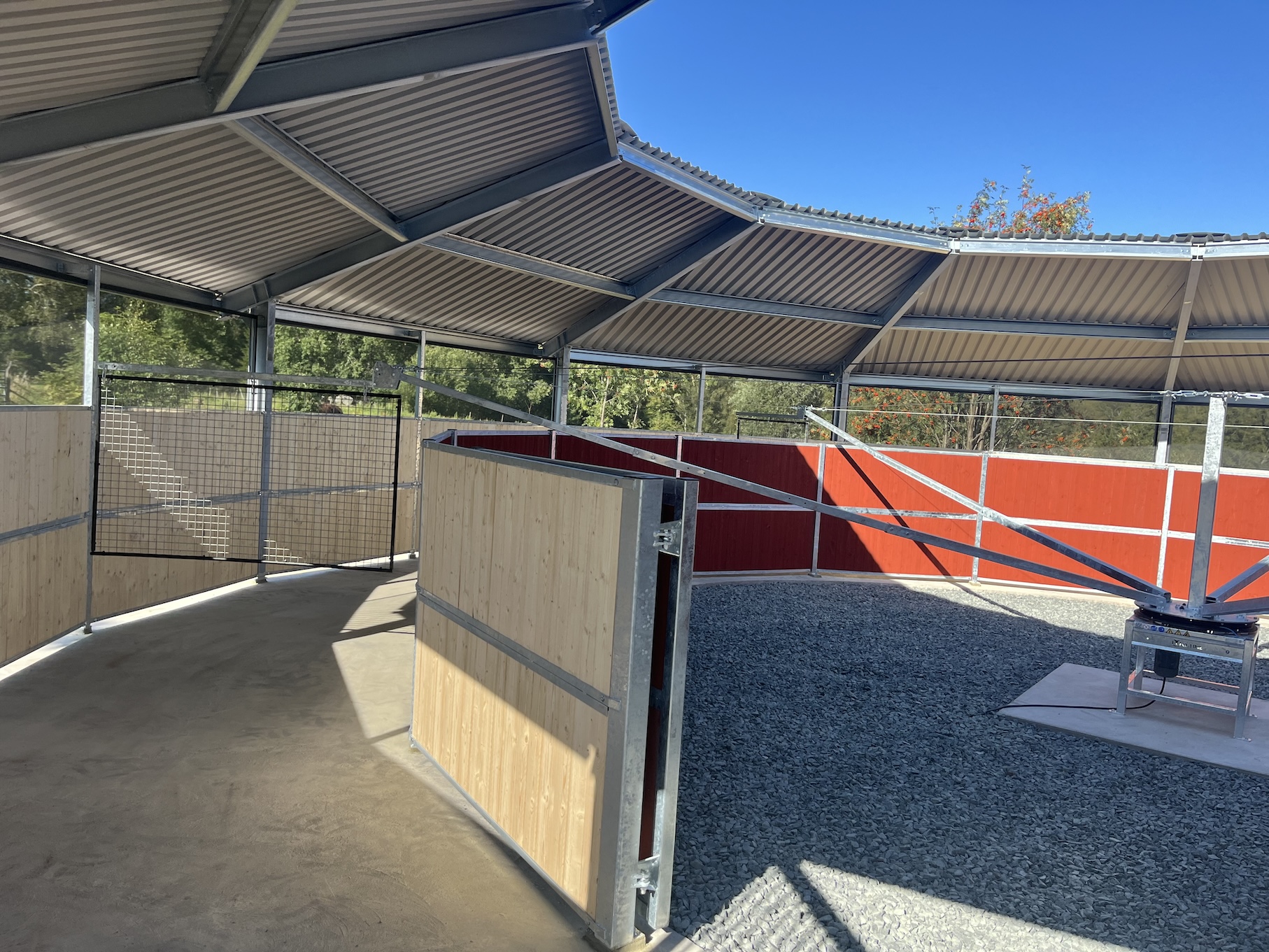För att skydda dina hästar mot väderförhållanden som sol, regn eller snö under den dagliga träningen i träningskarusellen, är en hovslags- eller longeringsöverbyggnad en idealisk lösning.